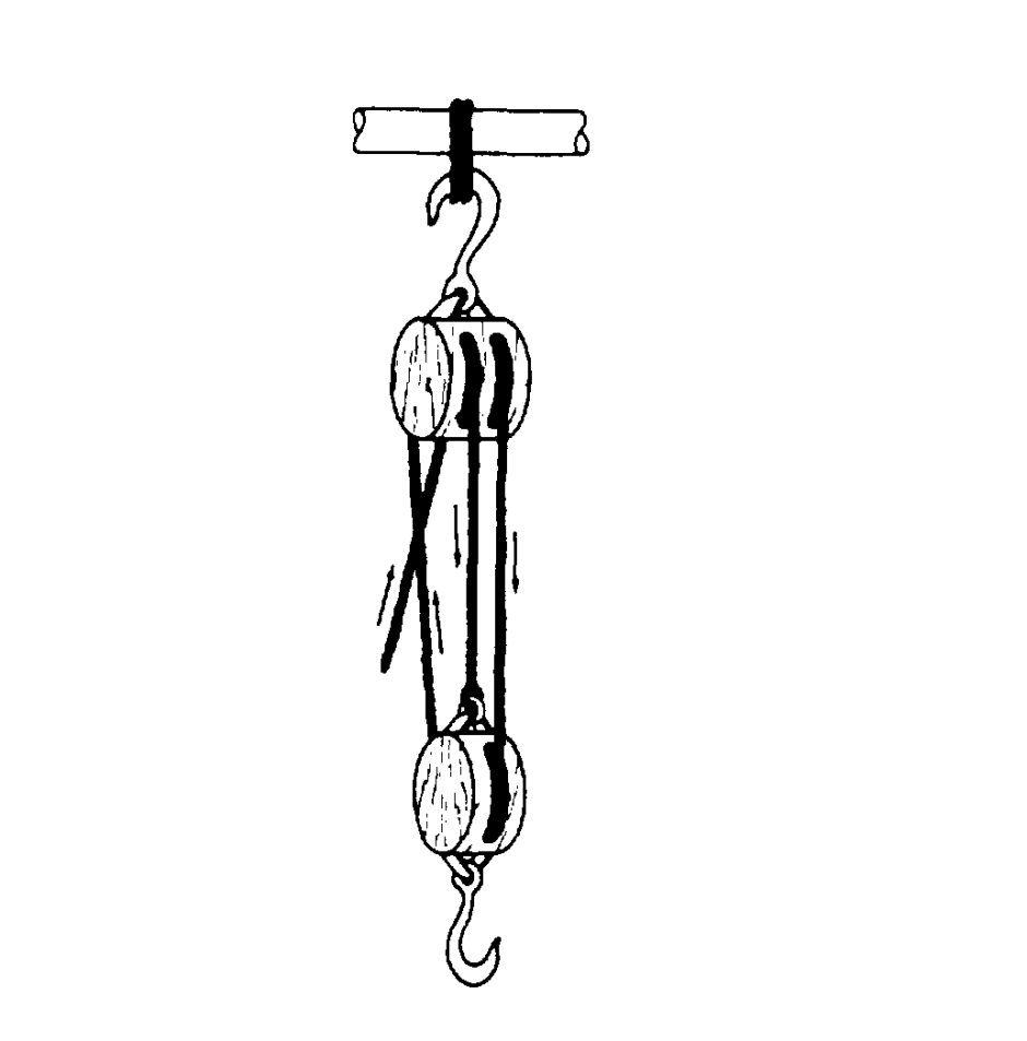 - Grace: Redo N6M.10 that goes with Figure N6.7, except instead of a single pulley, imagine using the block-and-tackle shown below. The hook holds the worker’s chair. The rope that isn’t connected to anything goes to the worker’s hands. With this block-and-tackle system, now how much rope tension does the worker have to hang on to to keep in position?