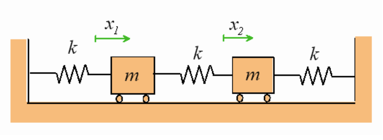 - Sasha: There are two types of solutions to the situation pictured below, and they are called “normal modes.” In the easier of the two modes to analyze, the two objects move together. Begin by drawing free-body diagrams for each cart. The gravity and normal forces hardly matter (because they must balance), but include them for completeness. The important forces are the forces exerted by the three springs on the two carts. Each cart has two springs acting on it. If the two springs move together (that is, if x1=x2), what is the whopping simplification in the equations?